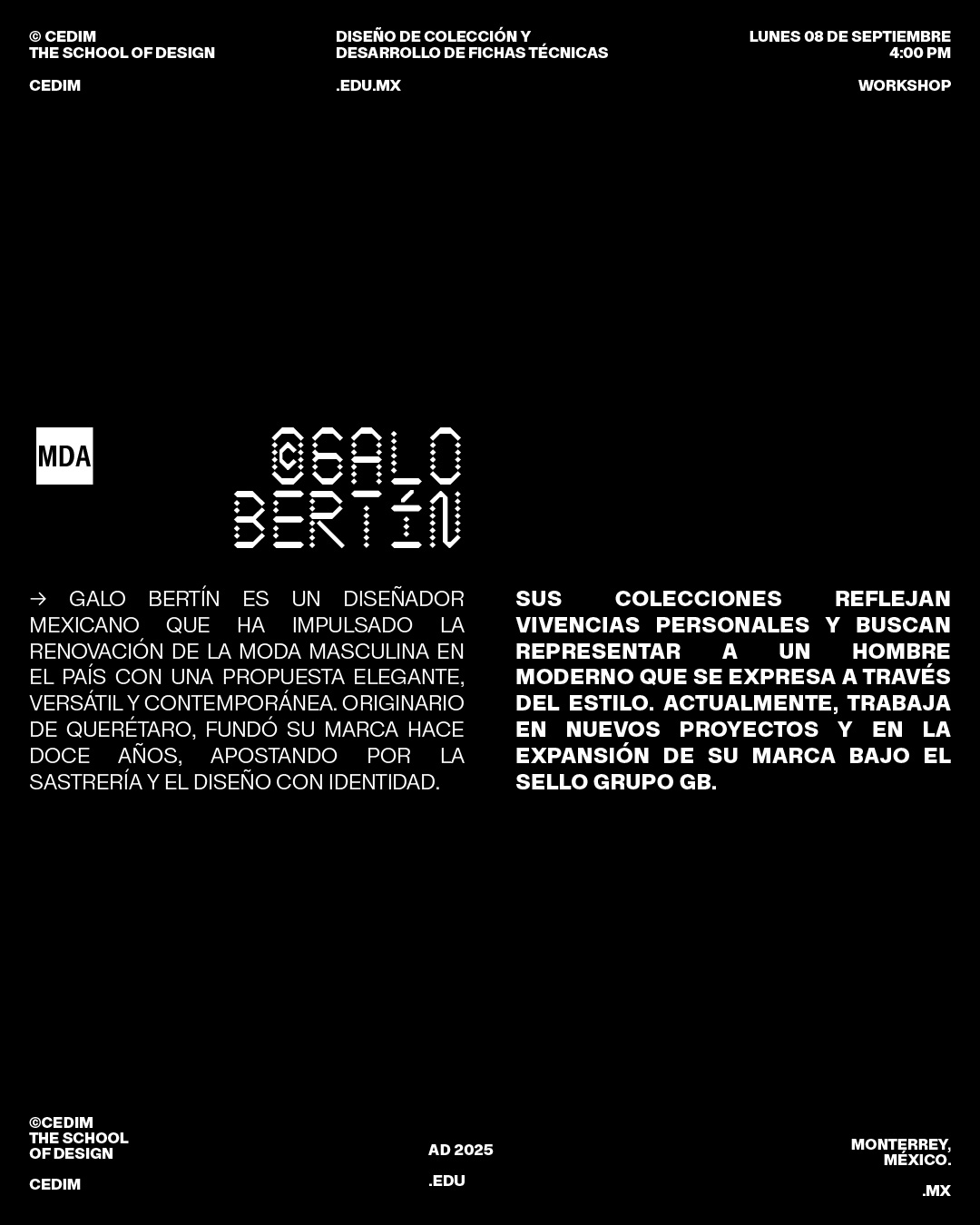 Próximamente, el cliente de 4º semestre de MDA, Galo Bertín, compartirá con el grupo de manera exclusiva un workshop presencial sobre Diseño de colección y desarrollo de fichas técnicas.